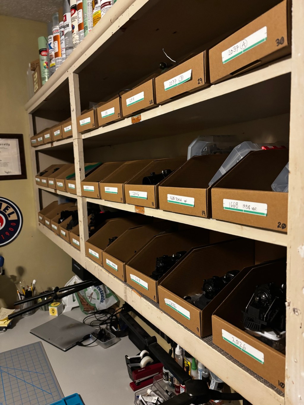 We are continuously improving our shop! To ensure your project doesn’t get lost in the mix, each project gets its own bin for the duration of the restoration. As you can see, we currently have 30 projects in the works. Most of these will be finished and available on our eBay store this week.